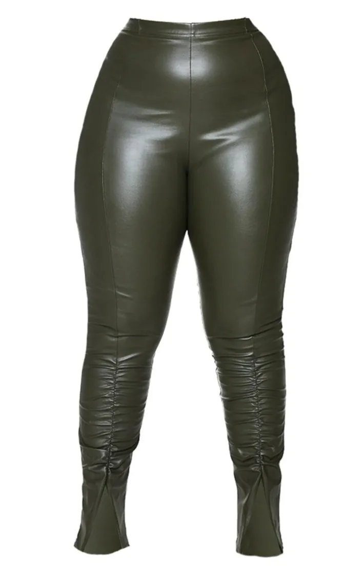 These pants are sure to be a staple piece in your new-season wardrobe doll. Featuring a khaki PU material with ruched detailing and split hems. Team with a corset top, an oversized jacket and clear heels to complete the look.