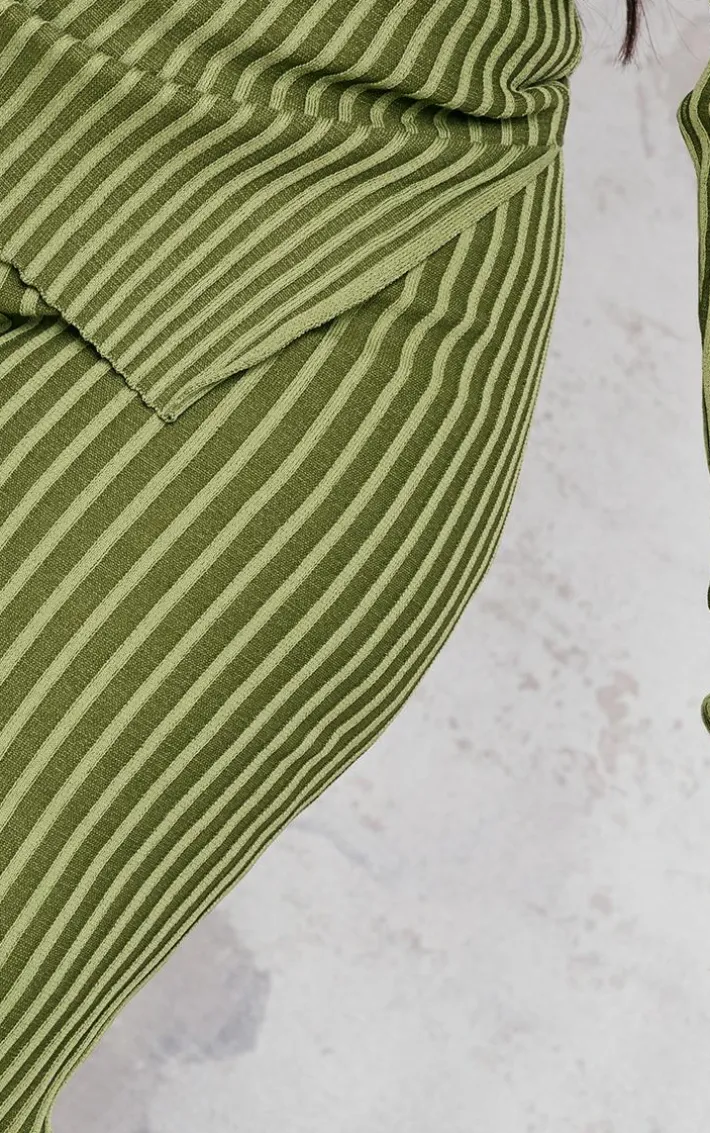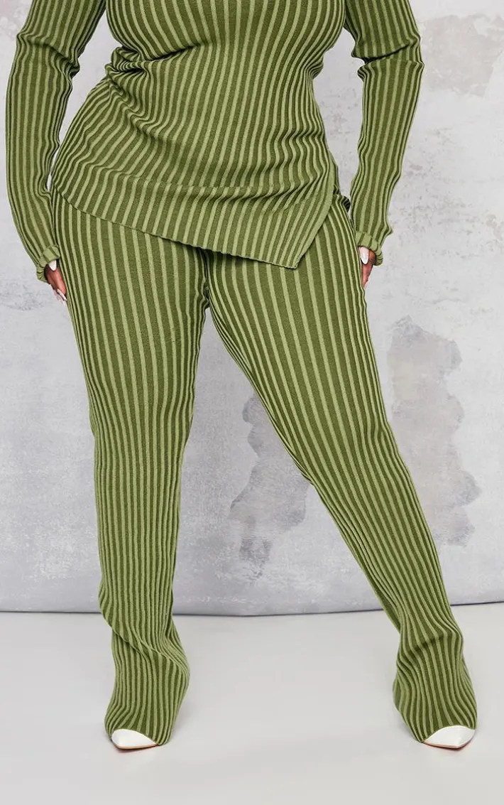 Earn some serious style points with these bottoms. Featuring a khaki rib knit material with a straight-leg fit and a high waist. Style with the matching top, a faux fur coat and heeled boots for a look that is sure to turn heads.