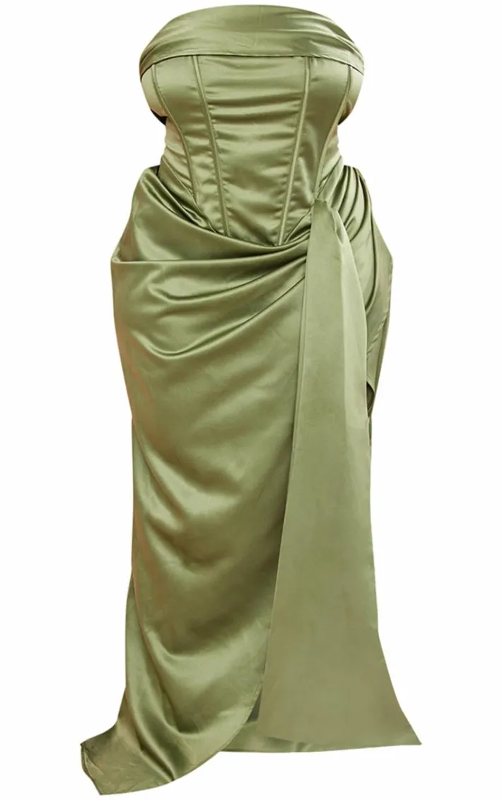 Turn heads for all the right reasons with this plus khaki satin draped bandeau corset maxi dress. Brought to you in a khaki satin material with a bandeau neckline and draped detail, this corset maxi dress is a must-have. Style with heels and gold accessories for a look that won’t miss.