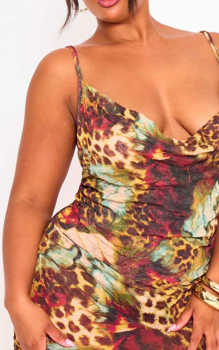 Step out in style with this plus leopard abstract crinkle mesh cowl neck mini dress. With an abstract leopard print design and cowl neck detail, you’ll be turning heads wherever you go. Pair with gold bangles and your best heels to look and feel your most glam.