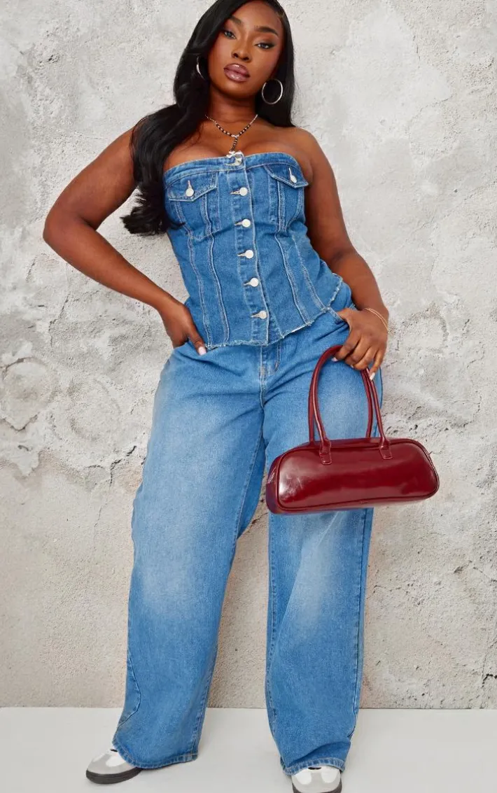 This plus light blue contrast seam detail pocket front corset bandeau denim top is calling your name for an unreal weekend ‘fit. Brought to you in a light blue denim material, with a contrast seam detail, pocket front design, bandeau neckline and corset style, get ready to feel snatched in all the right places. Pair with some wide leg jeans for an unreal double denim moment.