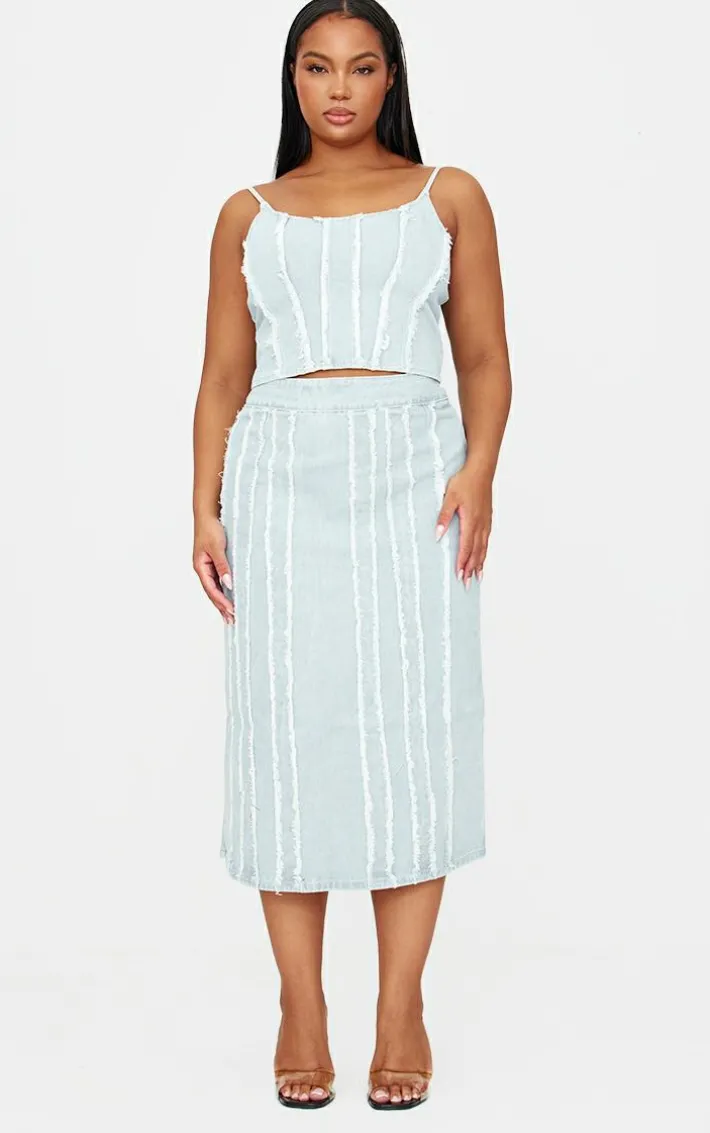 Hit refresh on your new season wardrobe doll with this plus light blue frayed seam detail denim corset. Brought to you in a light blue denim material with a frayed seam detail, this corset is calling your name. Style with denim shorts, fresh kicks and simple accessories to have all eyes on you.