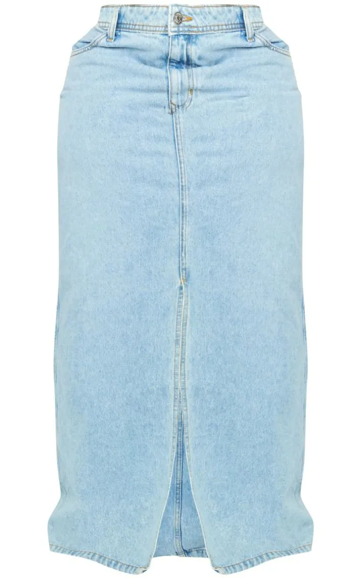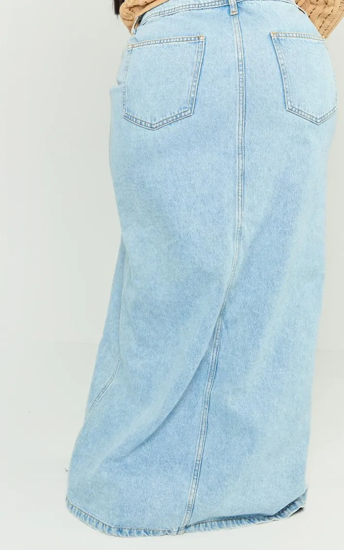 You are guaranteed to nail major trends in this plus light blue wash split front maxi denim skirt. Brought to you in a light blue wash denim material with a split front design and a maxi length, how can you say no? Style this plus denim skirt with a long sleeve top and heeled boots for an effortlessly chic look worthy of your next night out.