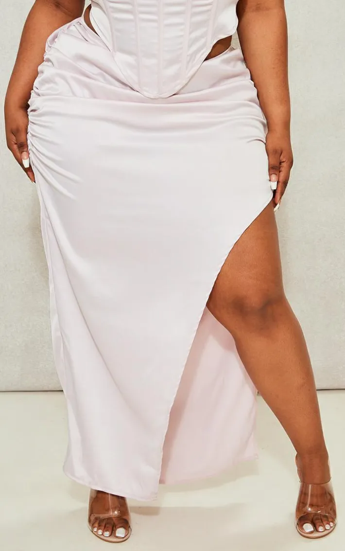Add some chic vibes to your wardrobe with this plus light pink satin ruched side split midi skirt. This skirt is brought to you in a light pink satin material for a touch of luxe we are loving. With a ruched detail and a side split, what more could you want? Team with a corset top and some clear heels to finish off the look everyone is talking about.