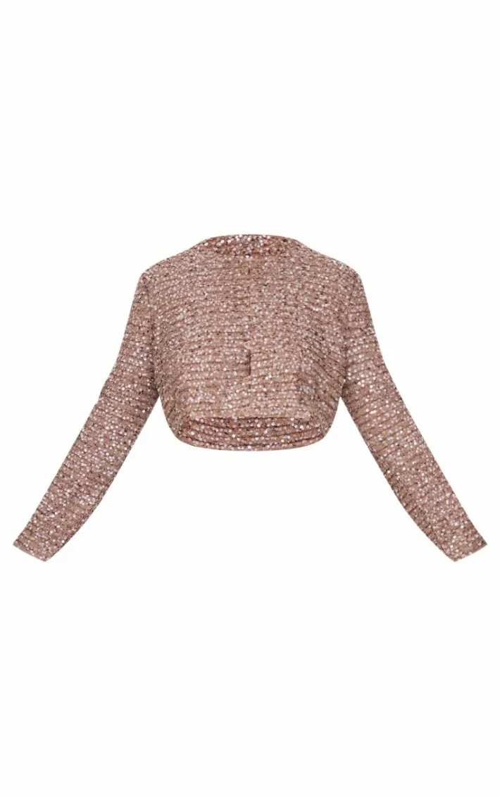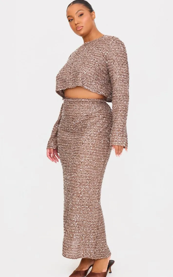 Keep it chic with this plus mocha sequin long sleeve button up crop top. Brought to you in a mocha sequin material with a long sleeve design and a button up fastening, this crop top is all you need to turn heads for all the right reasons. Team with the matching skirt and your fave accessories for a fool proof finish we are obsessing over.