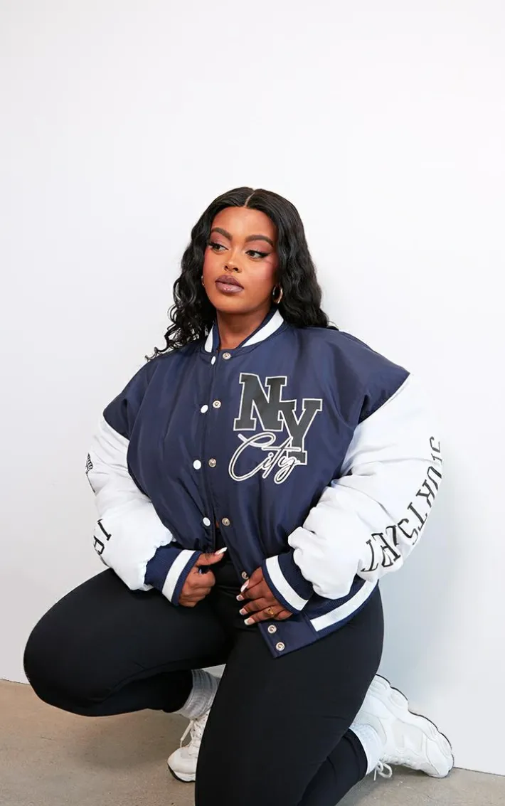 Make sure your new season ‘fit stays on point with this plus navy NY graphic bomber jacket. Brought to you in a navy hue material with a button up front, a ‘NY’ graphic design and a bomber jacket style that we are loving right now, you really can’t go wrong. Style this plus jacket effortlessly over your outfit of the day for a statement finishing touch.