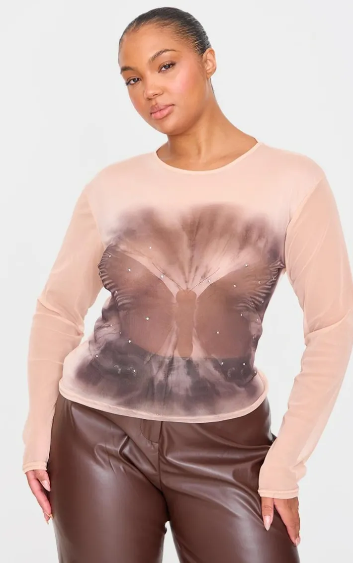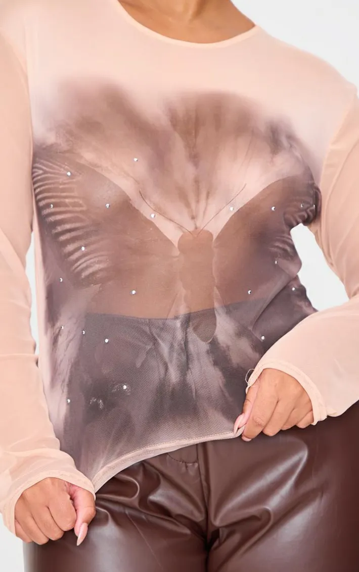 Own the night in this plus nude butterfly printed hot fix mesh top. Made from a nude mesh material with abutterfly print hot fix design, it’s perfect for solving those what to wear dilemmas. Why not pair this mesh top with your go-to pants and accessories for a look that will have all eyes on you?