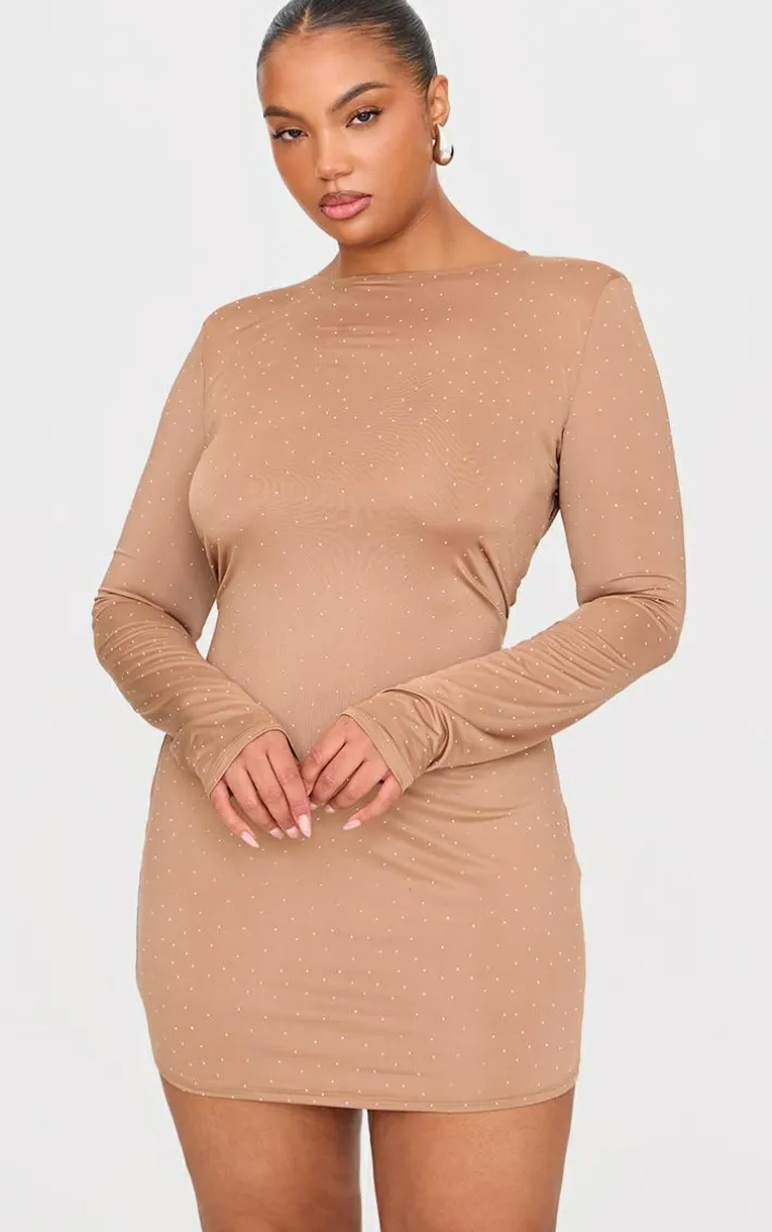Deciding what to wear just got easier with this plus nude hot fix long sleeve mini dress. Brought to you in a nude hue material with a hot fix detail and long sleeve design, this mini dress is all the new you need. How can you say no? Team with slip on heels and silver accessories for an elevated finish we can’t take our eyes off.