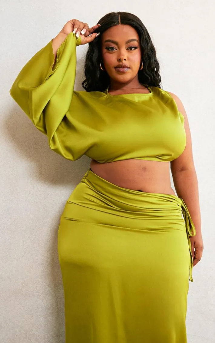 The weekend is here and that calls for a brand new ‘fit so check out this plus olive one-shoulder satin crop top. This crop top is brought to you in an olive satin material with a one-shoulder design and a cropped length, how could you turn this down? This crop top is here to banish any of your what-to-wear dilemmas. Pair this crop top with the matching skirt, high heels and accessories for a look like no other.