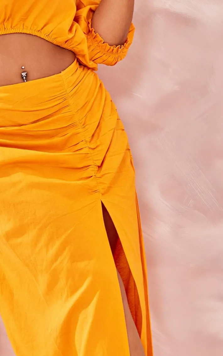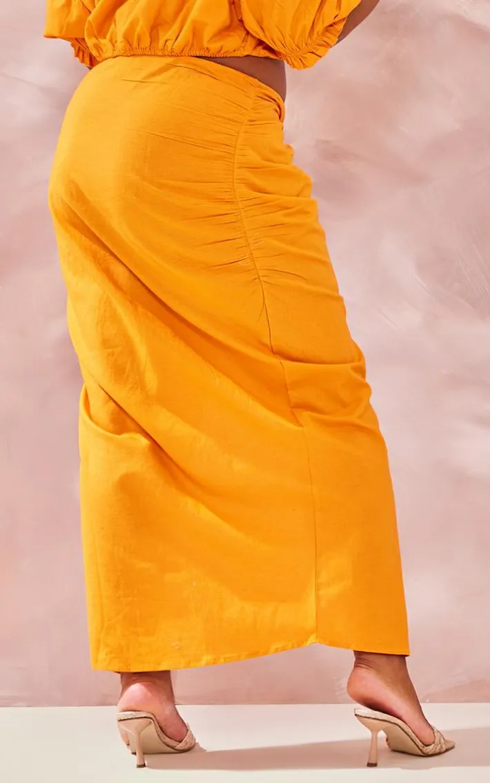 Your weekend outfit is finally sorted with this plus orange linen look ruched side split midi skirt. This skirt is brought to you in an orange linen look material for an effortlessly glam look we are obsessing over. With a ruched design and a side split detail, what more could you want? Team with some mule heels and some gold hoops to make a statement.