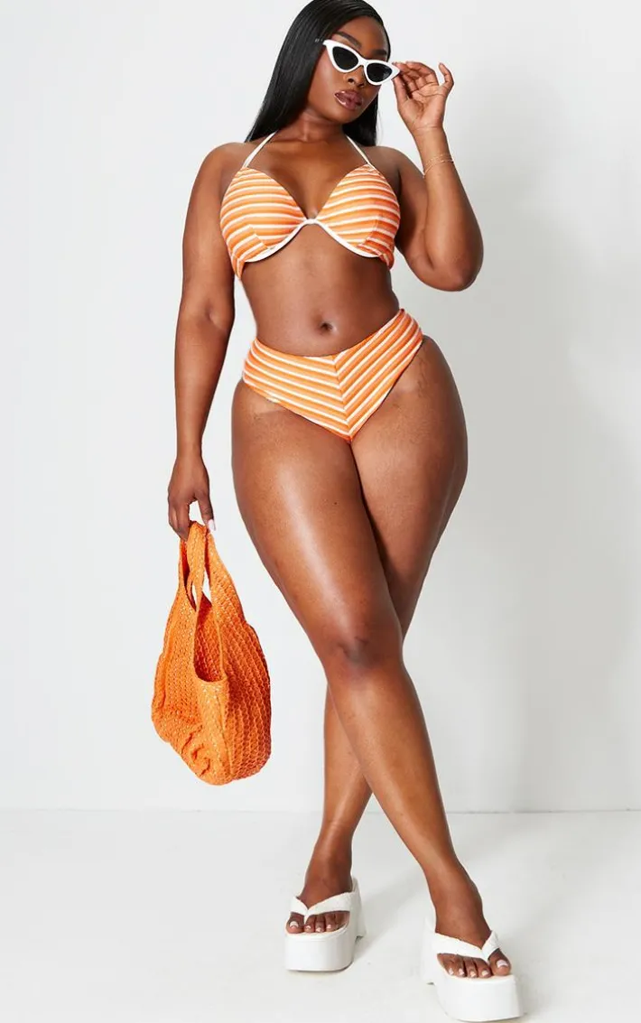 Brighten your vacay wardrobe with these plus orange striped bikini bottoms. Made from an orange hue material with a striped design and a flattering fit, what’s not to love? Style these bikini bottoms with the matching bikini top and statement gold accessories for a poolside look that is sure to turn heads.
