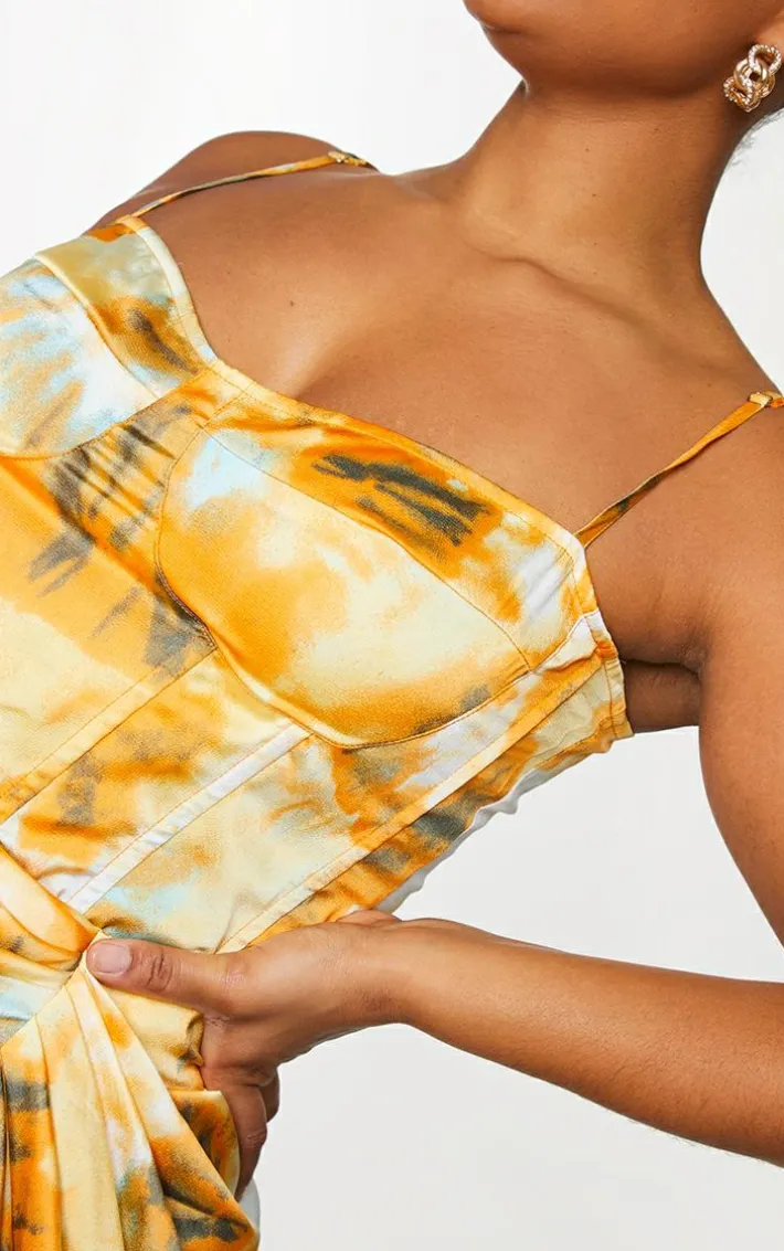 Earn yourself some serious style points this season in this dreamy top. Featuring an orange tie-dye printed material with a structured corset fit and thin shoulder straps. We love this styled with the matching midi skirt and completed with mules and a cute bag.