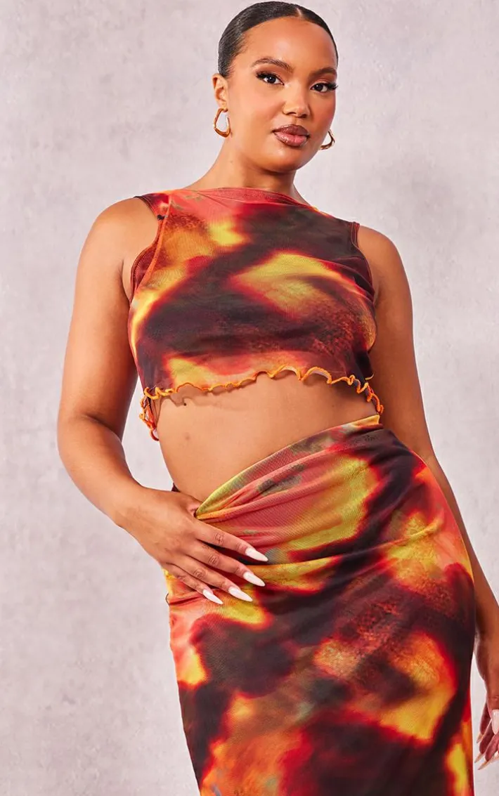 Dare to go bold in this plus orange tie dye printed lettuce hem mesh top. Brought to you in an orange hue mesh material with a statement tie dye print design that is sure to make you stand out from the crowd and lettuce hem detailing, how can you resist? We are loving this mesh top styled with the matching skirt, bold hue heels and gold accessories for a weekend-worthy look like no other.