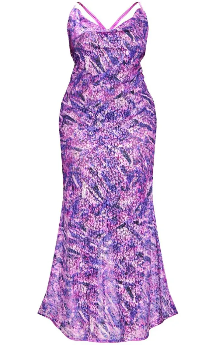 Make a statement this season with this dreamy plus purple sequin floral cowl neck maxi dress, you’re sure to create a look no one will forget. It features a purple sequin material with a floral print and a cowl neck, you won’t be able to resist. Style this maxi dress with slingback heels and hoop earrings for a flawless finish.