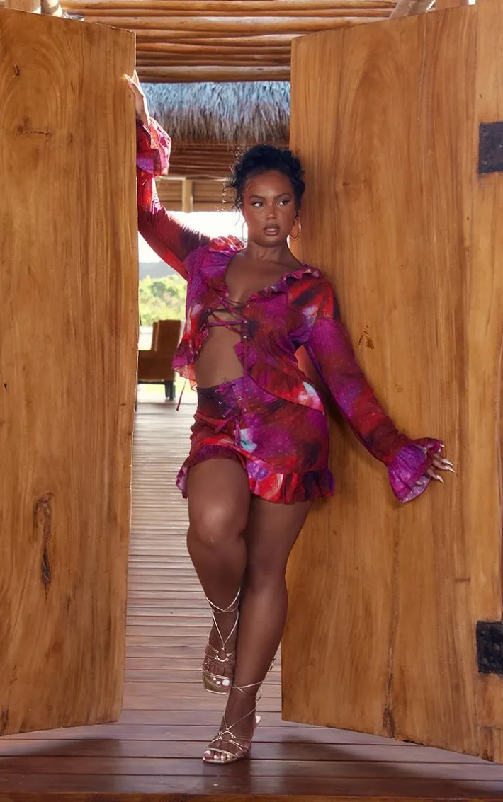 Get ready for the weekend with this plus red floral lace up ruffle hem skirt. Its red floral material adds some fiercely feminine vibes whilst its lace-up detailing gives you an extra edge. With a ruffle hem and a figure-flattering fit, this plus skirt is a must-have for your weekend plans. Style effortlessly with the matching top, clear heels and gold accessories for an insta-worthy finish.