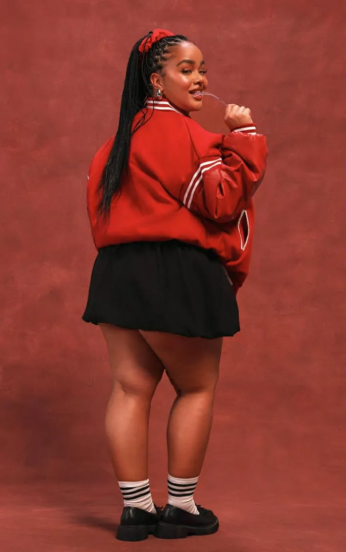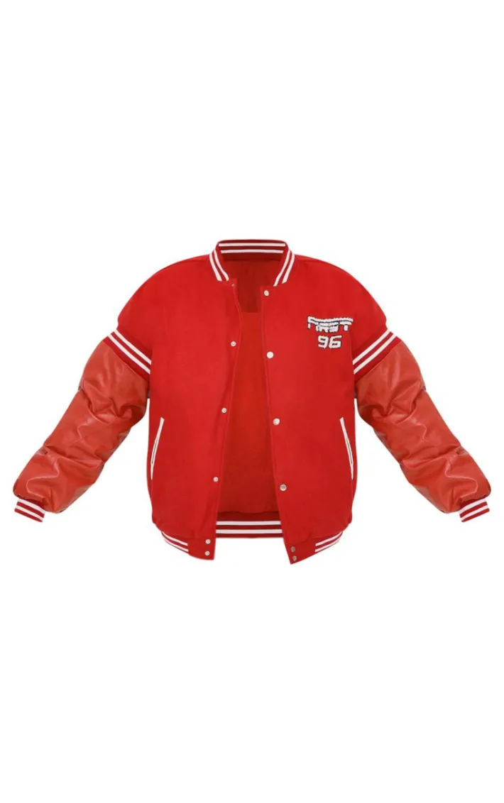 Nail new season trends with this plus red quilted faux leather sleeve oversized varsity bomber jacket. Made from a red quilted material with faux leather sleeves and an oversized fit, we are in love. Wear this red bomber jacket with a mini skirt, top and loafers for an everyday look that is sure to earnyou some serious style points.