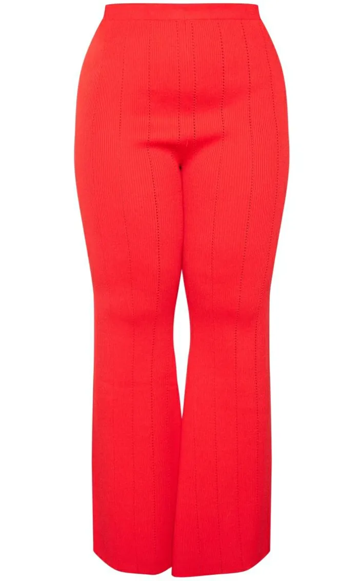 Be ready to have all eyes on you with these plus red rib knit flared pants. These pants are brought to you in a red rib knit material with a high waist and a flared fit, what’s not to love? These pants with it’s statement hue will have all eyes on you. Just add the matching top, high heels and accessories for a look that won’t let you down.