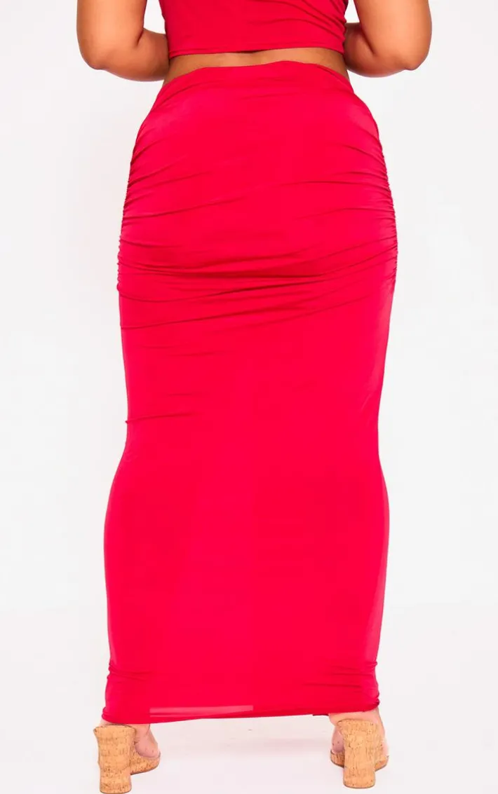Stand out from the crowd for all the right reasons in this plus red slinky drape detail maxi skirt. Brought to you in a red slinky material with drape detailing and a flattering maxi fit, how can you resist? We are loving this maxi skirt styled with the matching top, heels and gold accessories for a look they won’t forget.