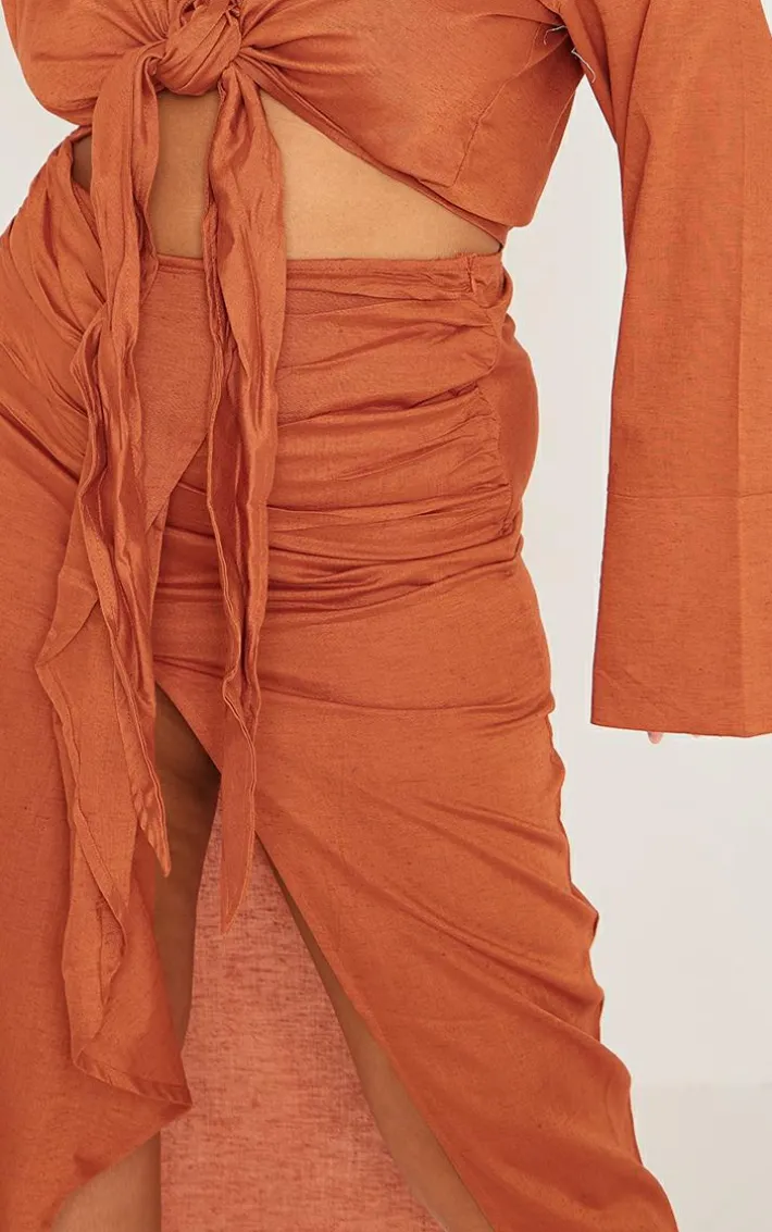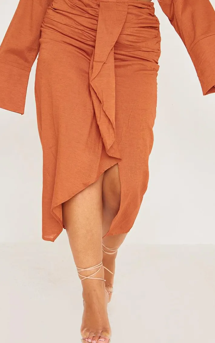 This plus rust linen look drape front midi skirt is here to banish any of your what to wear dilemmas. Brought to you in a rust linen look material with a drape front design, we can’tget enough. From start to finish this midi skirt will have you looking totally on-trend. For a next-level look simply style with the matching top and some slip on heels to make heads turn all season.