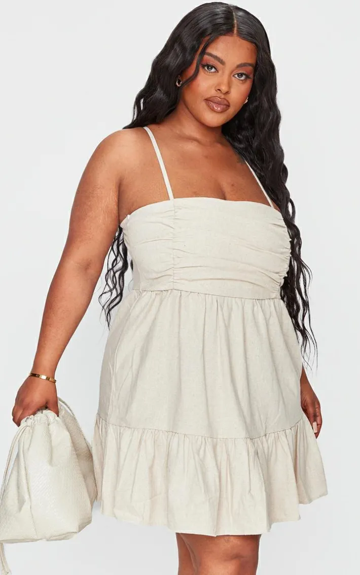For an Insta worthy look, this plus stone linen ruched bust detail tiered hem mini is essential. This mini dress is brought to you in a stone linen material with a ruched bust detail and a tiered hem, giving you a flattering fit you won’t be able to resist. This mini dress will have you feeling edgy all season. Why not team with a statement bag and your fave heels to complete the look everyone is talking about.