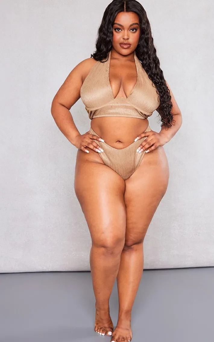 Show off your shape in these plus taupe plisse high leg bikini bottoms. Brought to you in a taupe plisse material for a little added luxe. With a high leg design for a flattering fit, you are sure to be showing off your shape in all the right places. Simply style with the matching bikini top and some gold accessories to finish off the look we are loving.