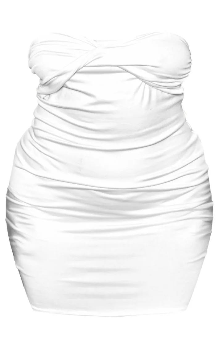 Steal all the stares in this plus white double contour twist bandeau ruched bodycon dress. Brought to you in a white double contour material with a twist bandeau neckline and ruched detailing, this bodycon dress is everything you need and more. Style with fresh kicks and your fave accessories for a chic take on an off-duty look.