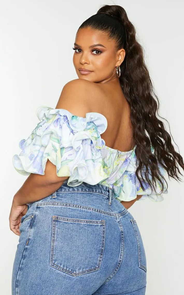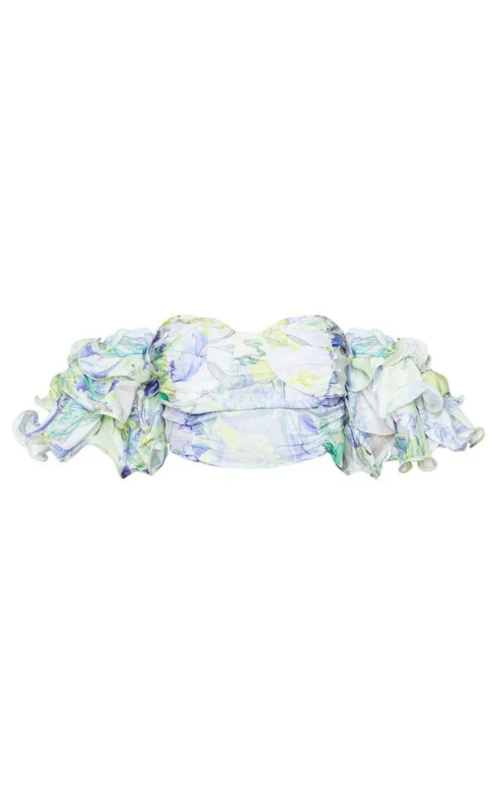 Add some drama to your outfit of the day with this crop top. Featuring a white floral fabric with ruffle puff sleeves and a bardot neckline, style with jeans and mules for the perfect date night look.