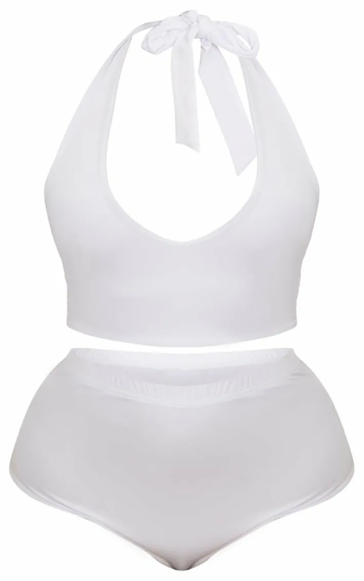 Get poolside ready with this bikini set. Featuring a halterneck style bikini top with matching high waisted bikini bottoms both in a white material. Just add oversized sunnies and a beach sarong for a chic finish.