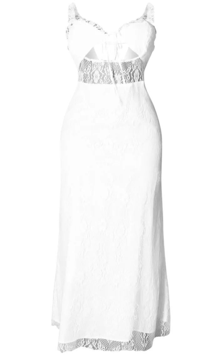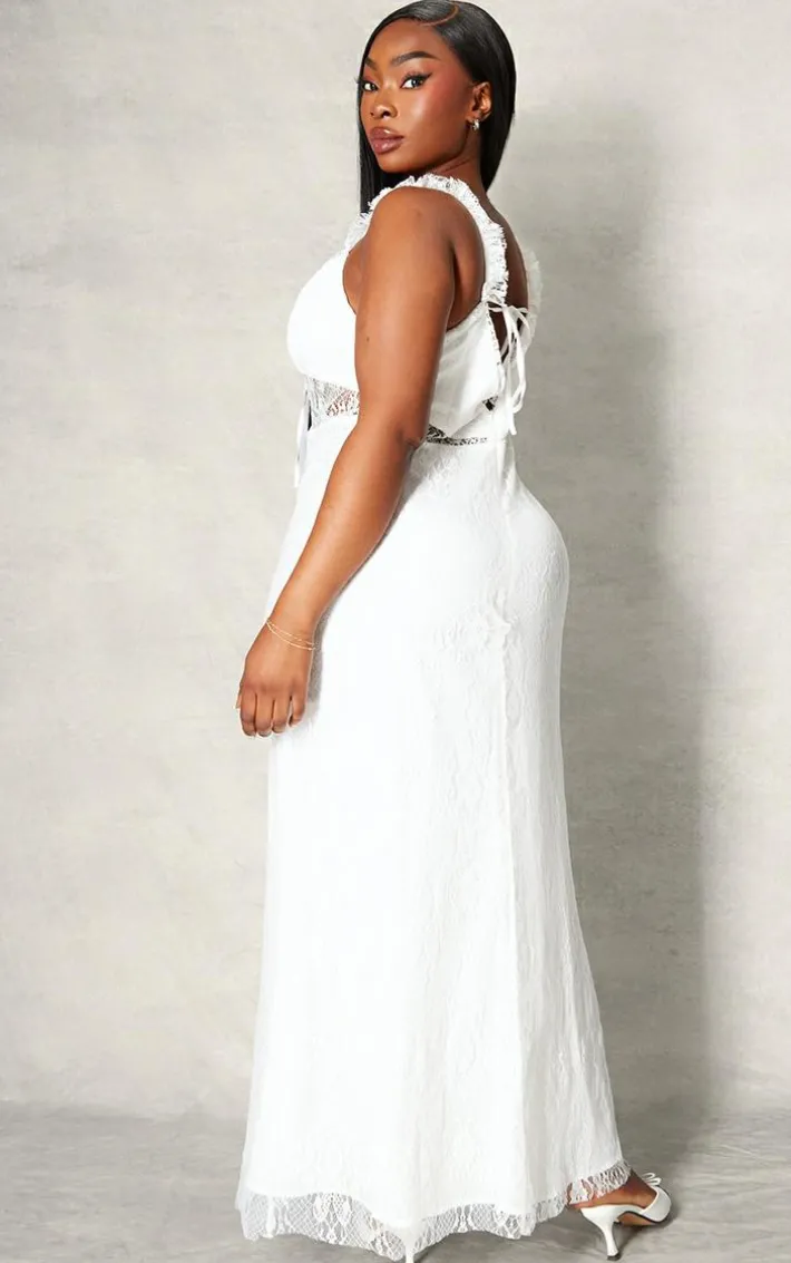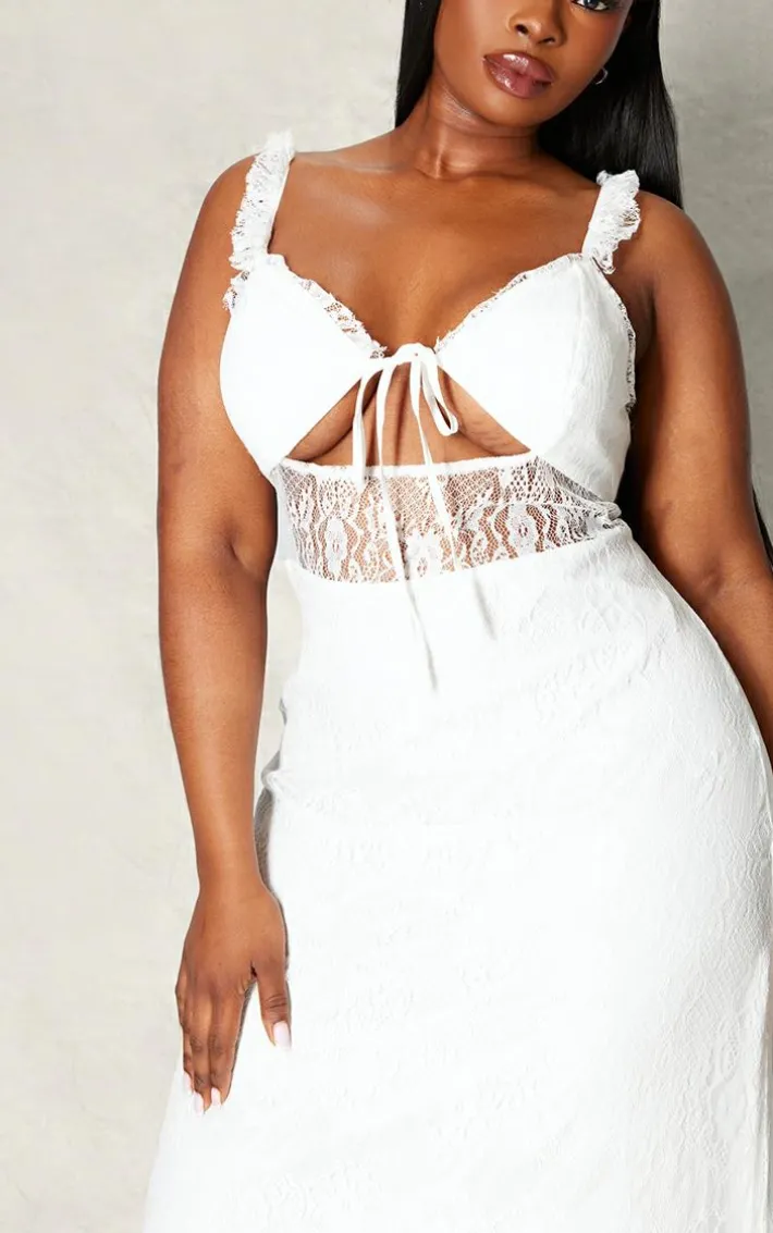 Take on your weekend the right way with this statement plus white lace tie front bust detail maxi dress. Made from a white lace material with a tie front, this maxi dress is everything we’re loving and more. With it’s bust detail, this dress has a figure-hugging fit that is sure to hug you in all the right places. To complete the look style this seamlessly with a pair of heels and accessories for a look that will secure you all the likes.