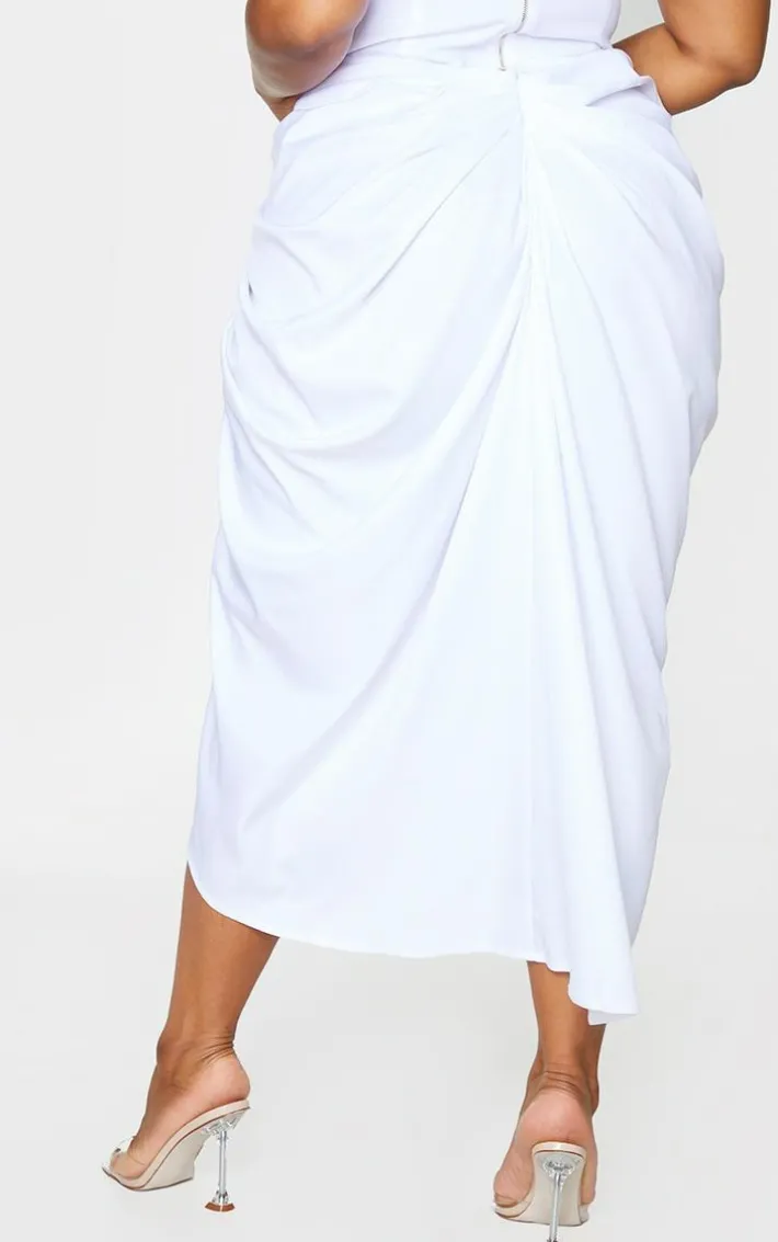 We are loving this skirt for your weekend wardrobe. Featuring a white material with a ruched side detail and midi length, what’s not to love? Complete the look with a white top and strappy heels for a super chic vibe.