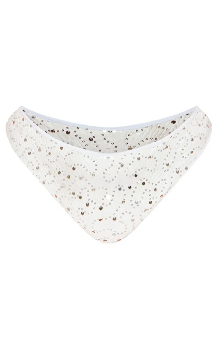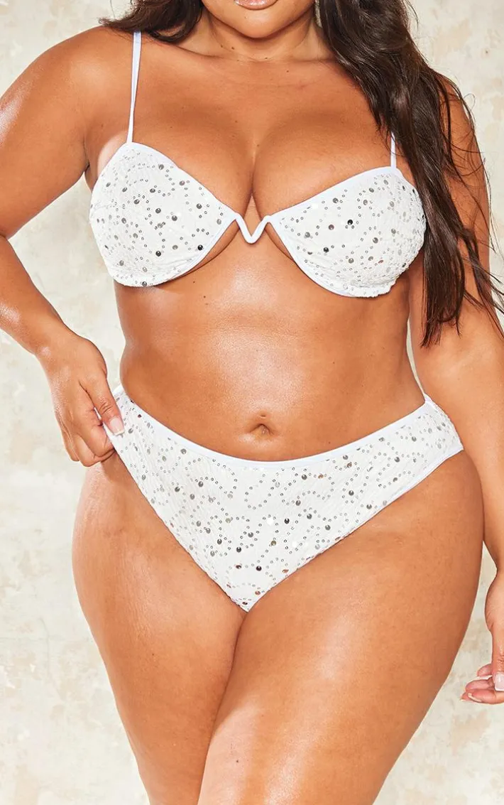 Have heads turning for all the right reasons with these plus white sequin high waisted bikini bottoms. These bikini bottoms are a perfect addition to your vacay wardrobe. With a white sequin material for a luxe vibe, and a high waisted design for a flattering fit you won’t be able to resist. These bikini bottoms pair perfectly with the bikini top and your fave accessories to elevate the look even further.