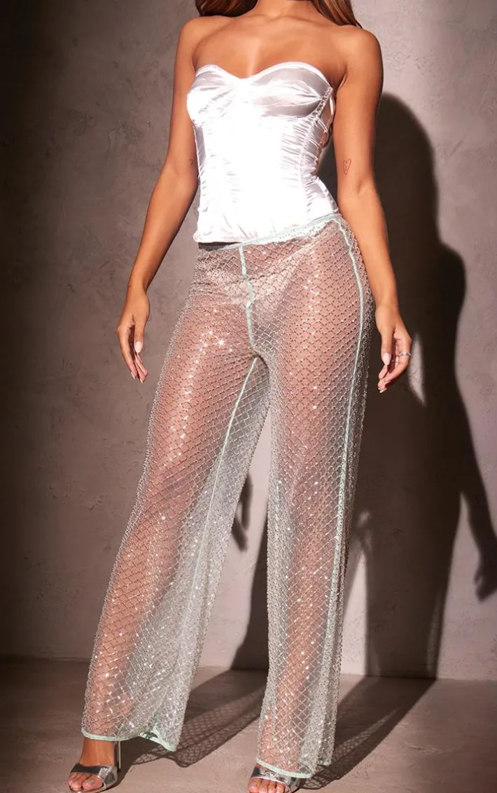 Give your new season wardrobe the ultimate glam upgrade with these aqua embellished sheer pants, you won’t be able to resist. Brought to you in an aqua hue material with an embellished design and a sheer style, you’ll be adding these pants straight to your basket. Pair with a satin corset top, heels and a mini bag for a flawless finish.