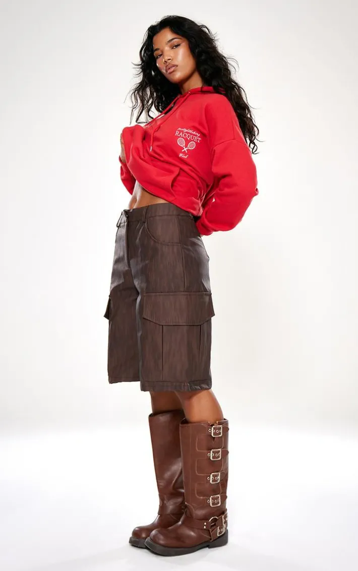 Switch up your new season style game with these premium brown washed faux leather long cargo shorts. Brought to you in a brown washed faux leather material with a cargo design and a longline fit, how can you resist? Wear these faux leather shorts with an oversized hoodie, knee length boots and statement accessories for a look that is sure to earn you some serios style points.