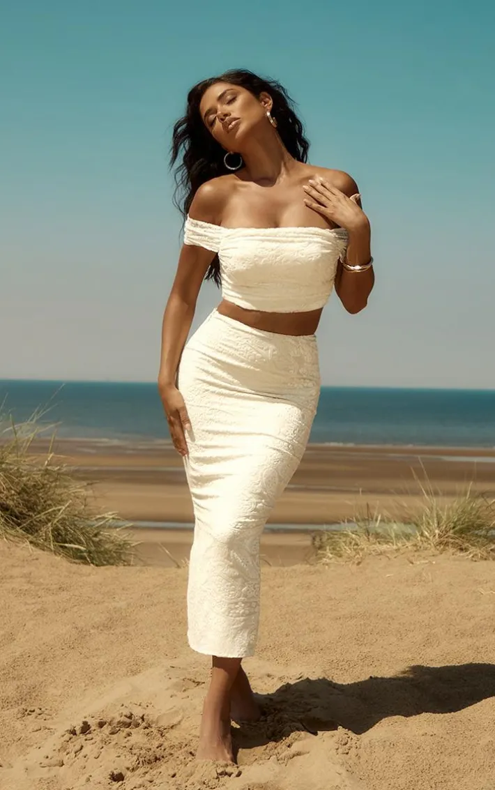 Take on your weekend the right way with this statement premium cream devore midaxi skirt. Made from a cream devore material with a midaxi length, this is everything we’re loving and more. With it’s figure-hugging fit this skirt is sure to hug you in all the right places. To complete the look style this seamlessly with a corset top and some comfy sandals for a look that will secure you all the likes.