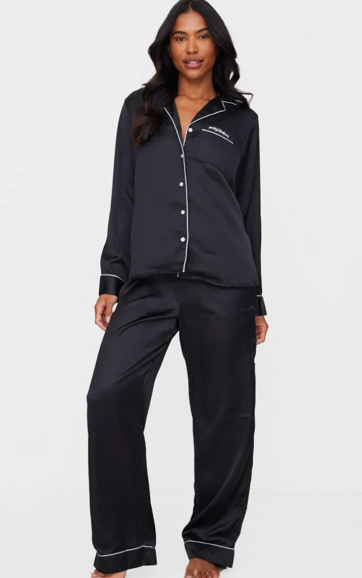 We are obsessing over this PrettyLittleThing black contras piping satin long PJ set for a chilled night in. Brought to you in a black satin material with a long sleeve fit, and a button-up fastening, we are obsessed. Its contrast piping and a long fit, what more could you want? Style this set with slippers to complete the look.