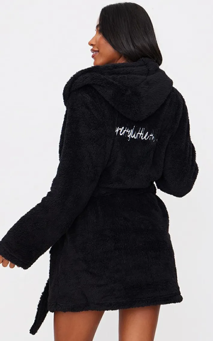 Wind down in this seriously comfy bath robe. Featuring a black fluffy material with a ‘PrettyLittleThing’ logo embroidered on the back, a hooded design and a tie waist, team it with your fave PJs and slippers to complete the look.
