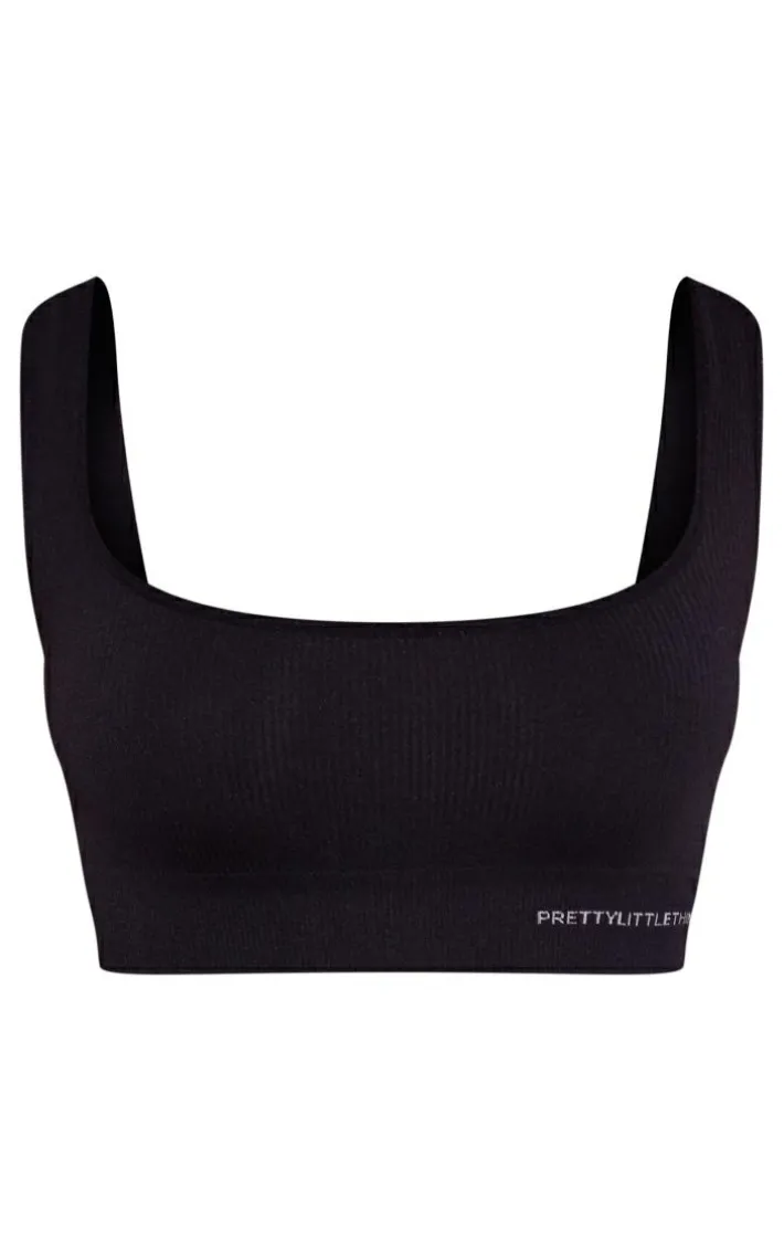 Add some comfy vibes to your lingerie collection with this bra. Featuring a black material with a PrettyLittleThing logo, a seamless design and a square neckline. Wear with the matching bottoms to complete the look.