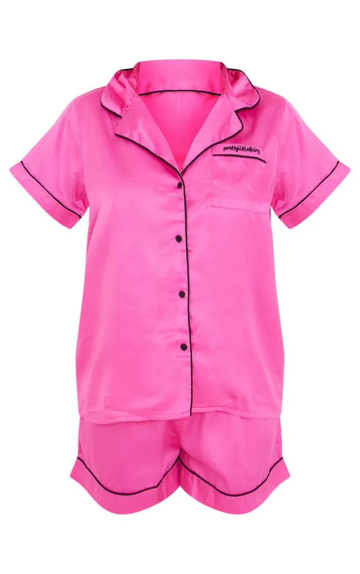 Add some luxe vibes to your PJ collection with this pj set. Featuring a button-up shirt with a contrasting PrettyLittleThing graphic and elasticated shorts both in a hot pink satin material with contrasting black binding, what’s not to love?