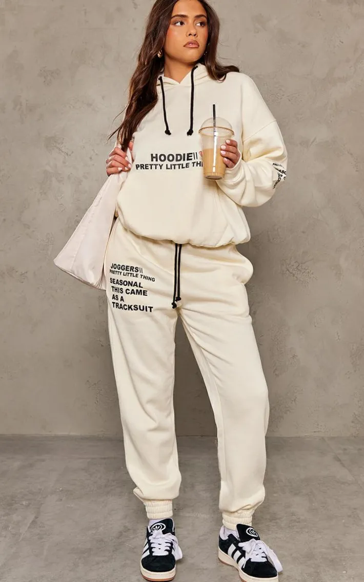 We are obsessing over these bottoms for your off-duty look. Featuring a cream material with a ‘PrettyLittleThing’ graphic design and an elasticated waistband, we’re obsessed. Team these with the matching hoodie and fresh white kicks for a look we’re loving.