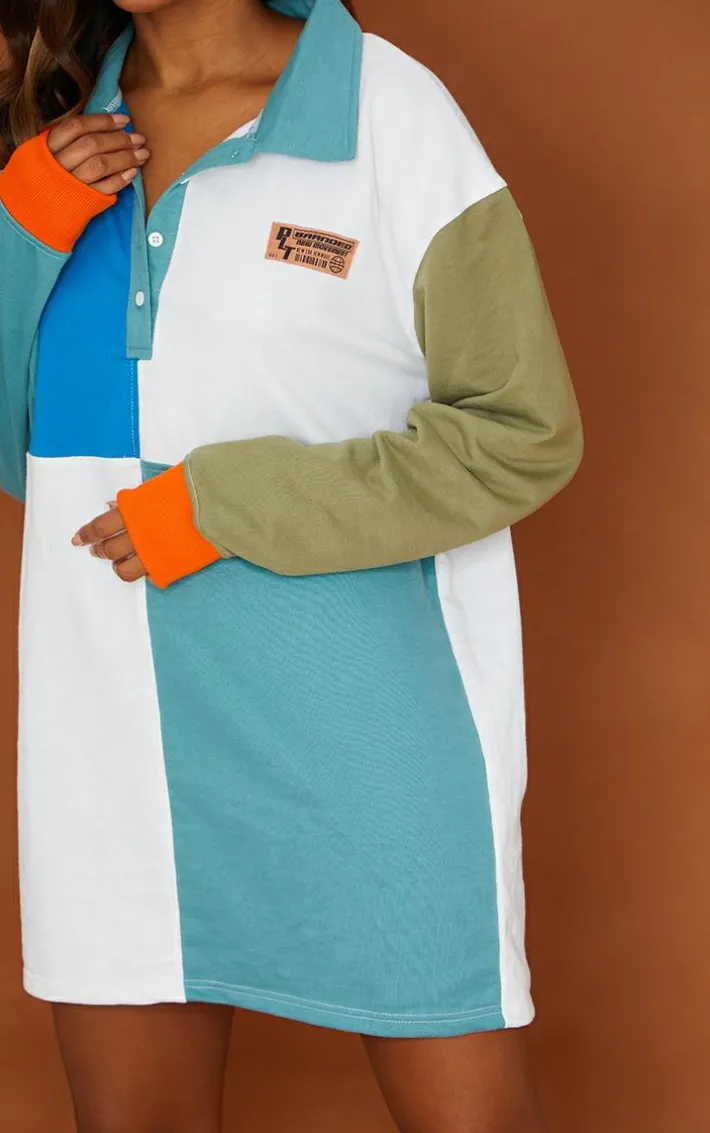 Switch up your usual outfit ofthe day with this PrettyLittleThing mineral blue contrast block detail sweatshirt dress. Brought to you in a mineral blue sweat material with a contrast block design and button detailing, how could you say no? This sweater dress also features a relaxed fit and collar that is sure to add that extra edge to your look. Style effortlessly with fresh kicks and minimal accessories for a look that will turn heads for all the right reasons.