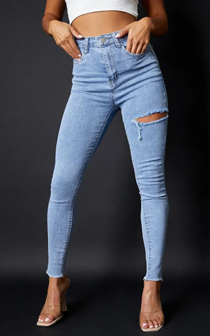 Take your look to the next level with these jeans. Featuring a vintage wash denim fabric with a thigh rip and a skinny fit. Style with a simple bodysuit, oversized blazer and mules for a day.