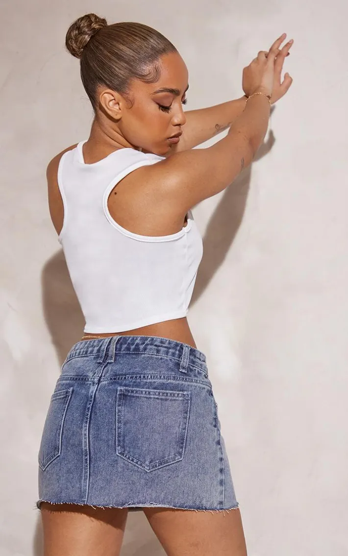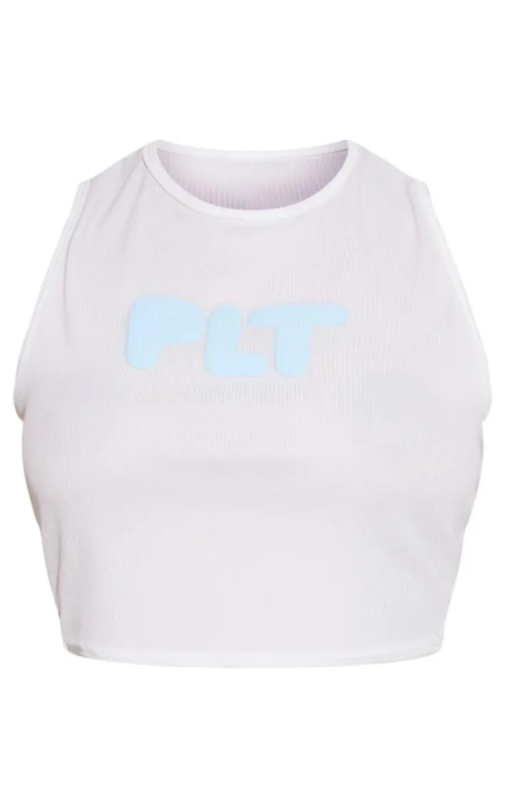 Give your new season wardrobe a fresh upgrade with this PrettyLittleThing petite white bubble rib racer crop top. It’s sure to be your new go to on those off-duty days and beyond. This crop top includes a white ribbed material with a contrasting PLT bubble print and a racer style. Team with a denim skirt, box fresh kicks and a shoulder bag for a simple but chic finish.
