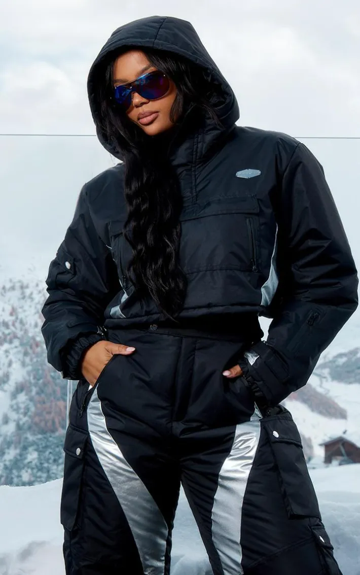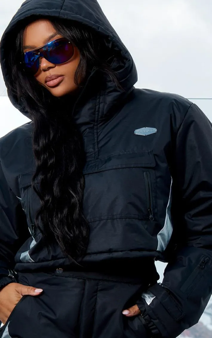 Take your look to a whole new level this ski season with this PrettyLittleThing plus black reflective panel pull over cropped puffer coat. Brought to you in a black hue material with a reflective panel design, a pull over style and a cropped fit, you really can’t go wrong. Wear this puffer coat with the matching bottoms, snow boots and your go-to winter accessories for the perfect finishing touch to your look.