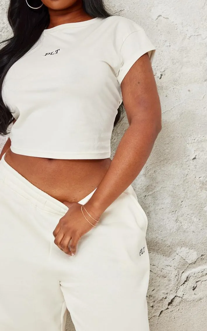 Hit refresh on your off-duty wardrobe with this PrettyLittleThing plus cream contrast embroidery fitted cap sleeve t-shirt. Brought to you in a cream hue material with a ‘PrettyLittleThing’ contrast embroidery design and cap sleeves, what’s not to love? Team this cream t-shirt with the matching bottoms and sneakers for a look that is perfect for everyday styling.