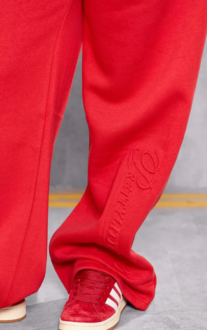 Brighten up your off-duty wardrobe with these PrettyLittleThing plus red embossed Graphic straight leg sweatpants. Brought to you in a red hue material with a ‘PrettyLittleThing’ embossed Graphic print design and a straight leg fit, what’s not to love? Style these red sweatpants with the matching Sweatshirt and your fave pair of sneakers for a look that will make you stand out from the rest.