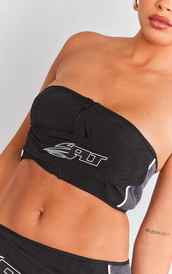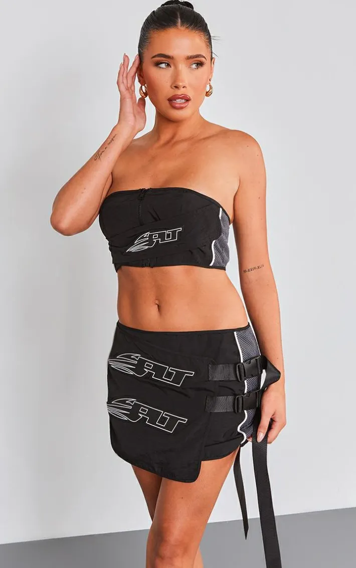 Take your weekend look to new heights with this PrettyLittleThing premium black motocross zip bandeau. Brought to you in a black hue material with a bandeau neckline, zip detailing and a motocross design that we just can’t get enough of right now, you really can’t go wrong. Style this black bandeau seamlessly with the matching mini skirt, heels and accessories for a look that is sure to turn heads wherever you go.