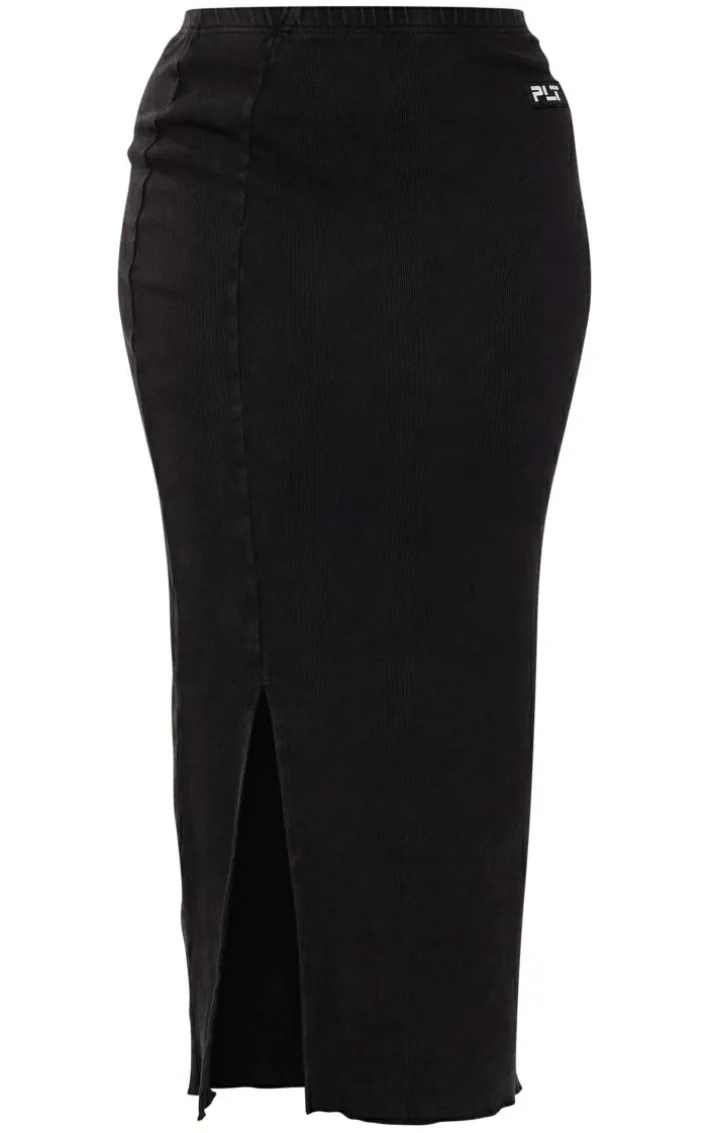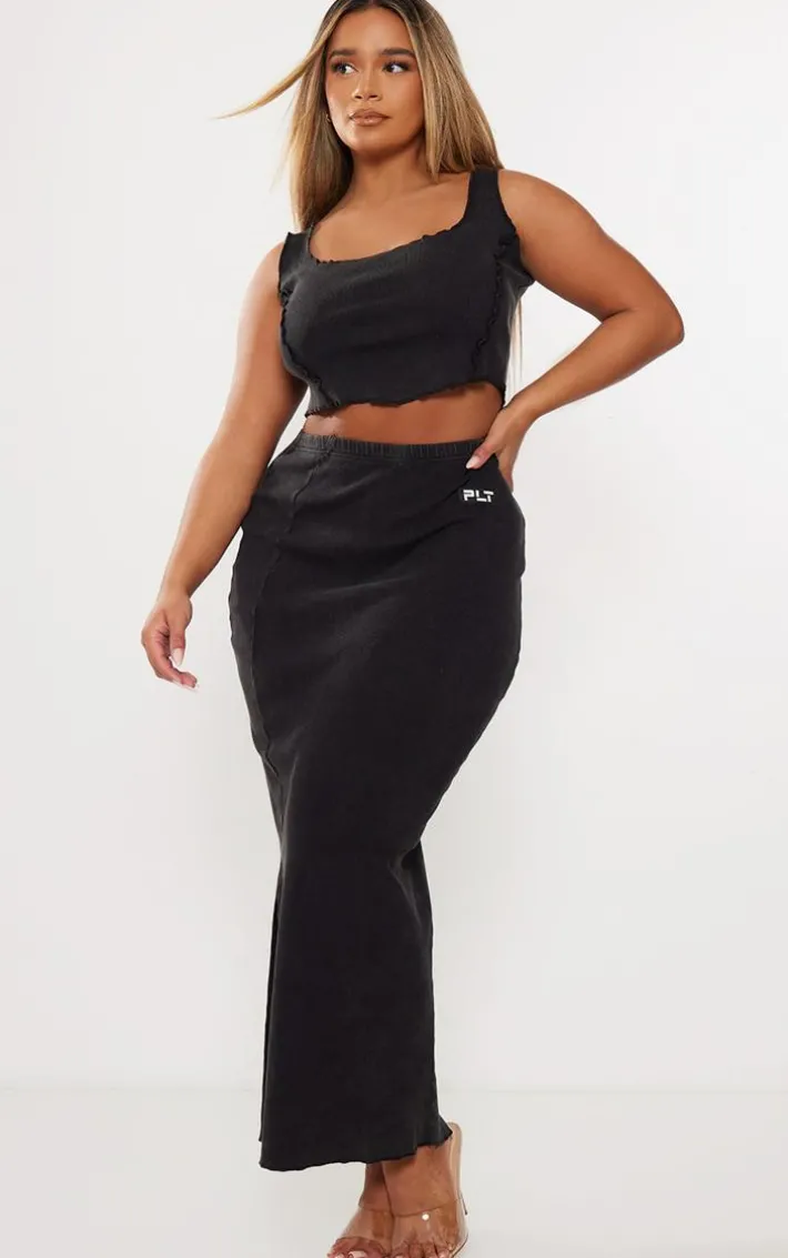 Make room in your wardrobe for this must-have PrettyLittleThing black heavy rib badge lettuce hem maxi skirt, it is perfect for your weekend plans and beyond. With a black heavy ribbed material, a lettuce hem design and a maxi length, this shape skirt just went straight to the top of your hit list. Just add the matching skirt, clear heels and your fave accessories for a look everyone will want.