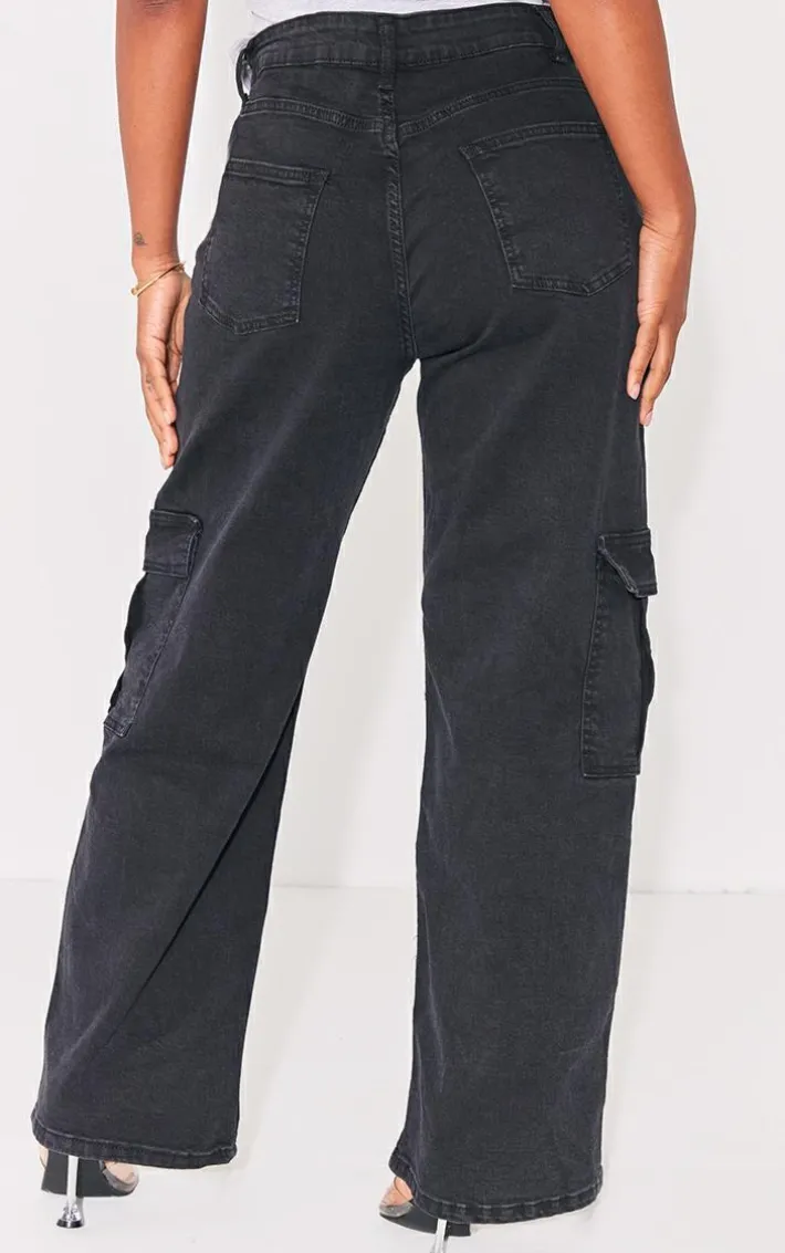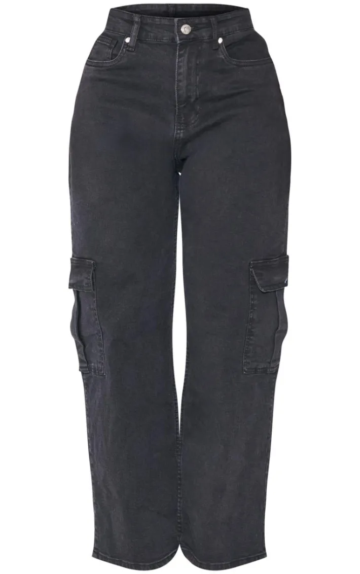 These jeans are sure to give your look a serious update. Featuring a black washed denim material with a wide leg fit and a cargo style. Wear these with a a crop top, a contrasting shirt and heels to complete the look.