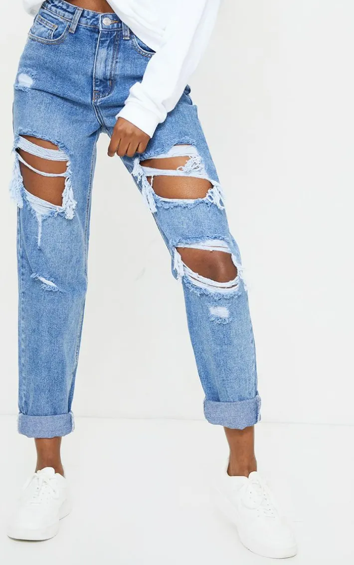 We are loving these jeans to elevate any look. Featuring a mid blue denim material with distressed rip detailing and a figure-flattering fit, team these with a white bodysuit and complete the look with some lace-up kicks.