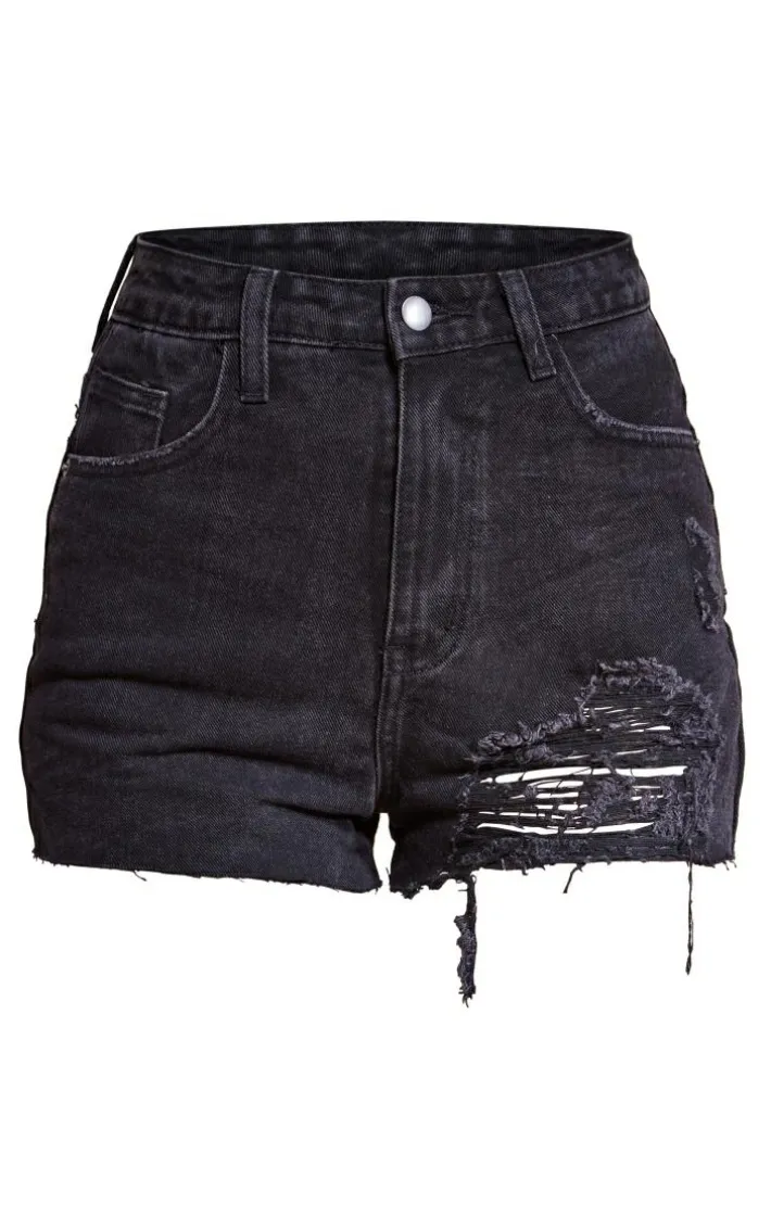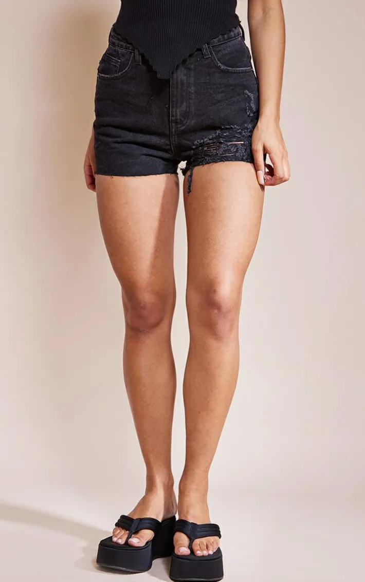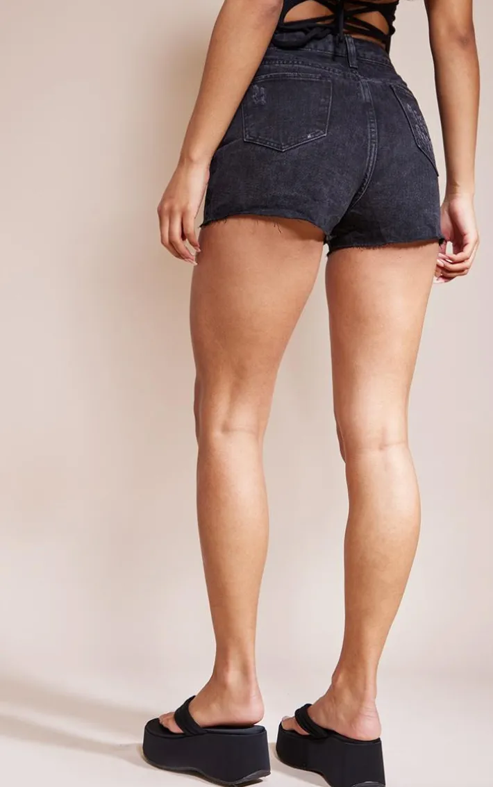 Any look can be made effortlessly chic with these distressed denim shorts. Featuring a washed black denim fabric with distressed detailing and raw hems, team these shorts with a white drop arm Vest and chunky kicks to finish the look.